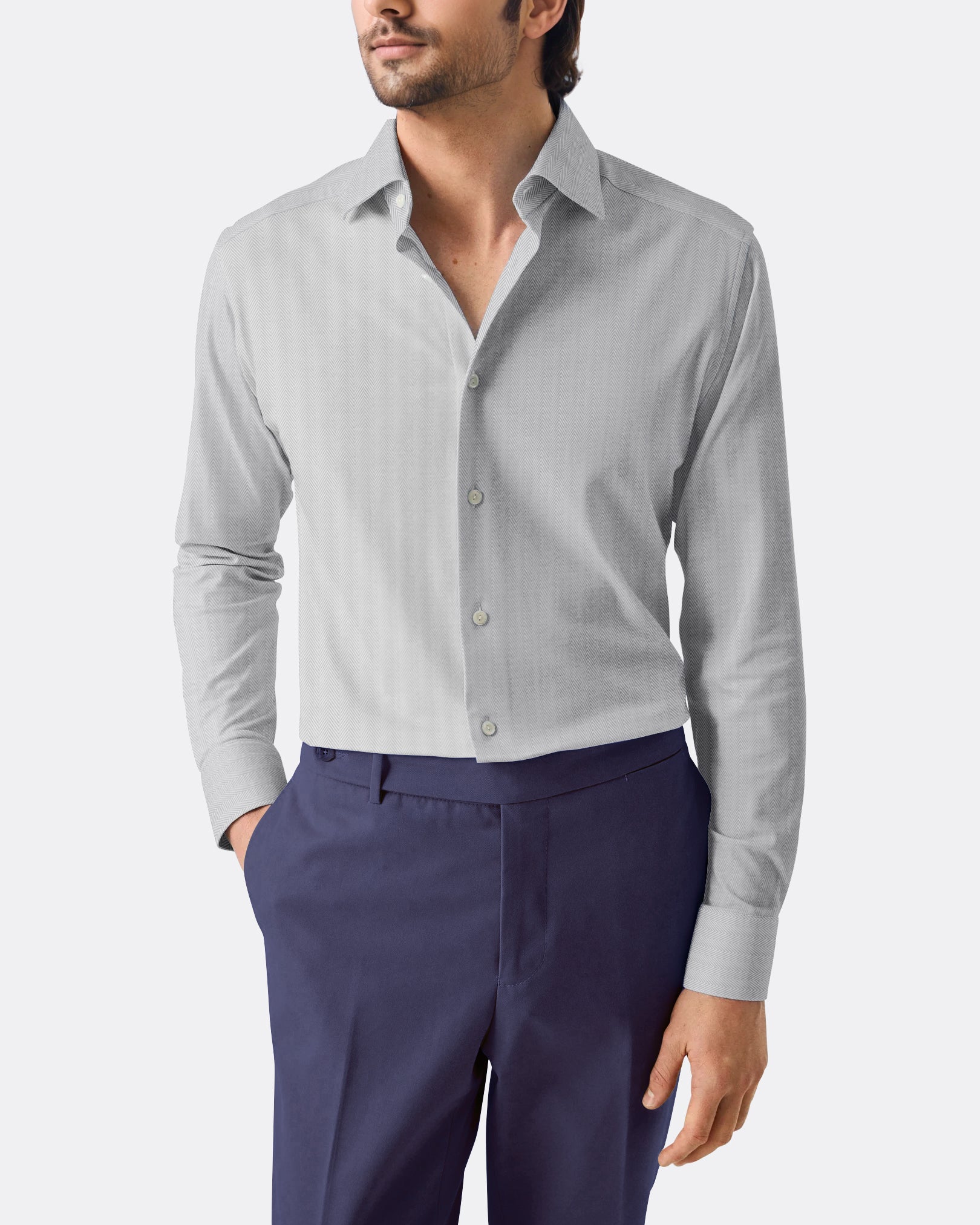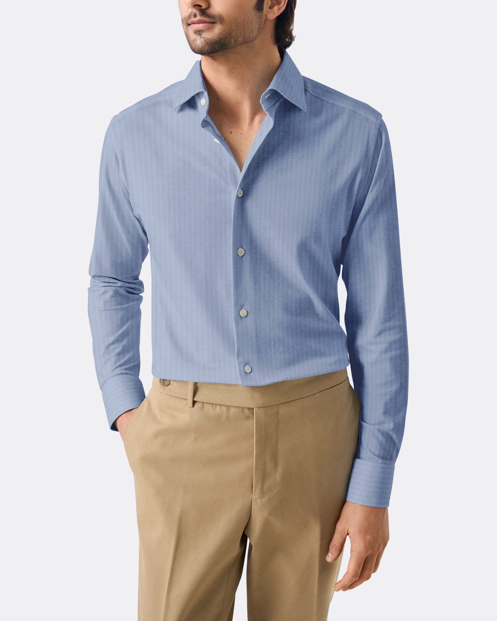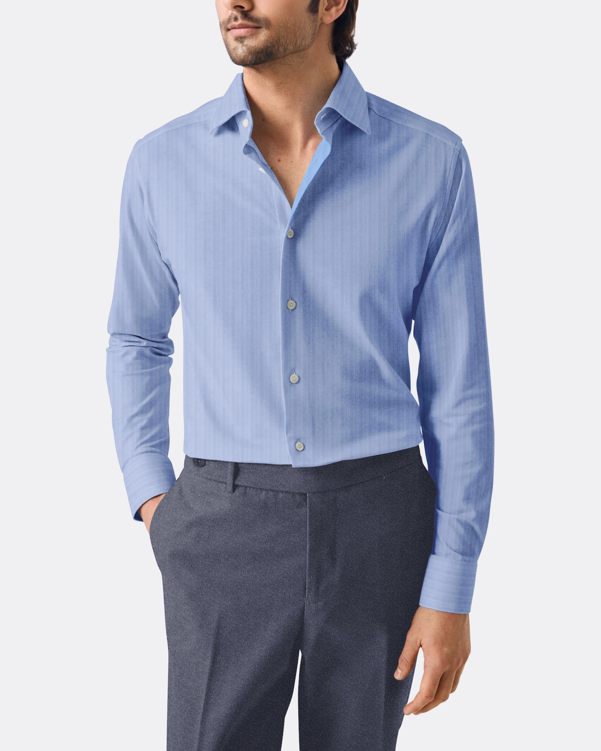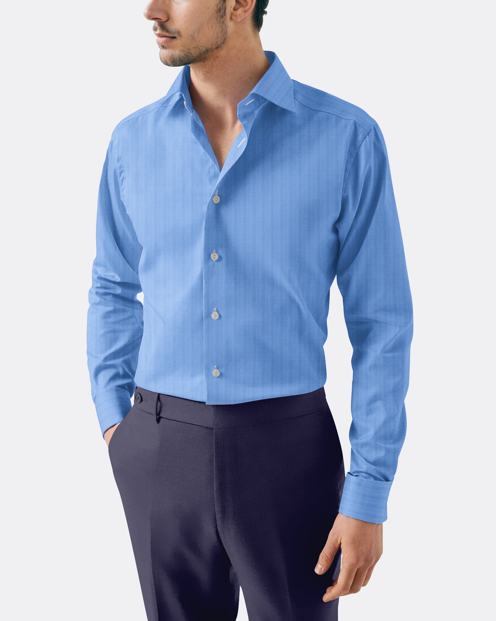 The Sky Blue Fine Herringbone offers a lighter take on textured shirting. Easy to pair with navy or grey suiting, it�s an ideal business shirt for maintaining a polished look through long workdays.