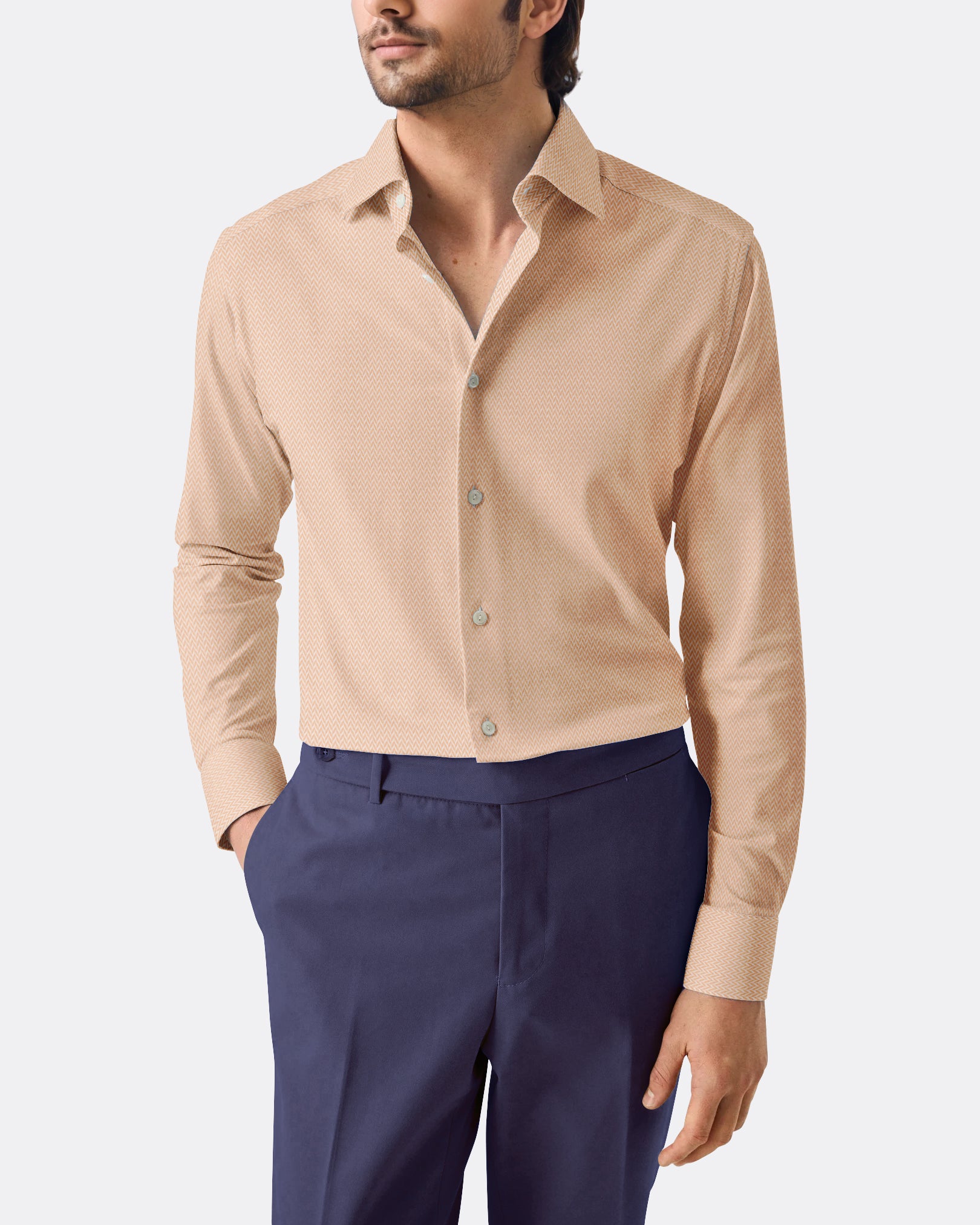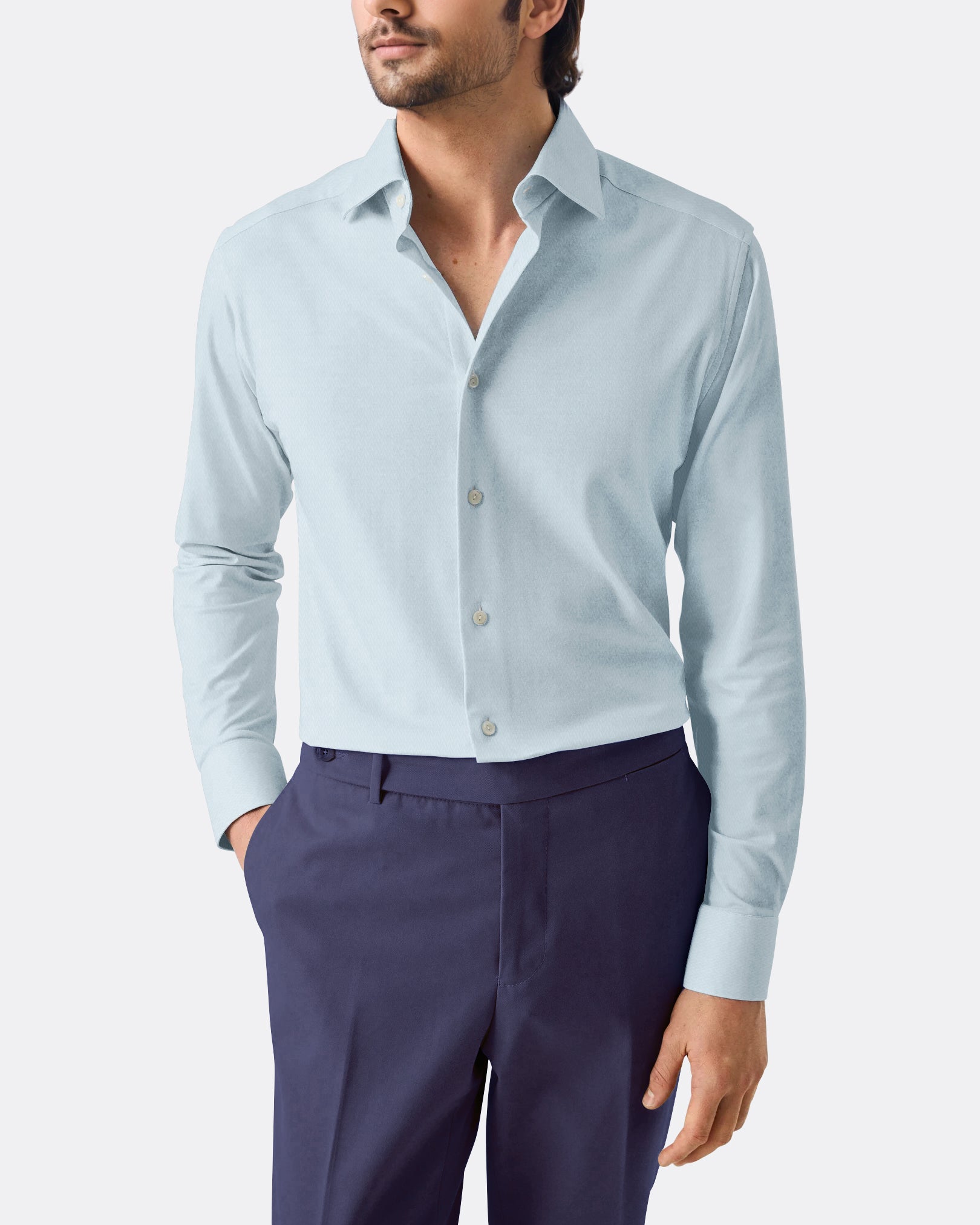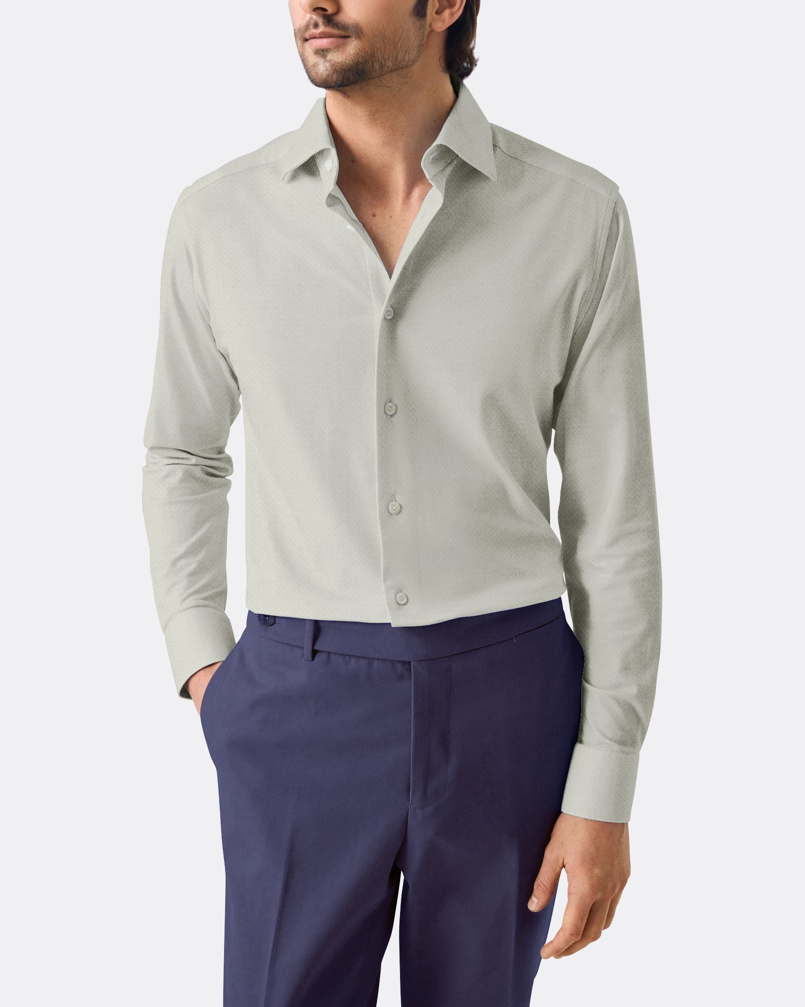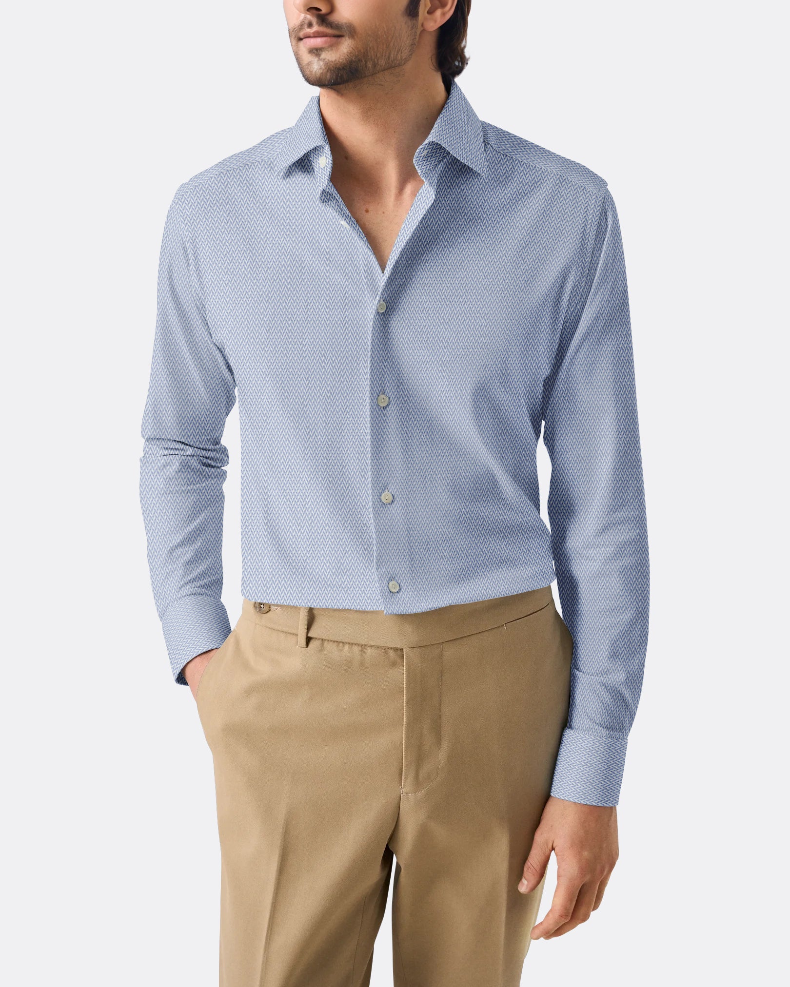 The Denim Blue Micro Herringbone Shirt blends texture with a rich, versatile tone. The medium spread collar adds structure, making it a smart-casual staple. Works well with both tailored trousers and denim.