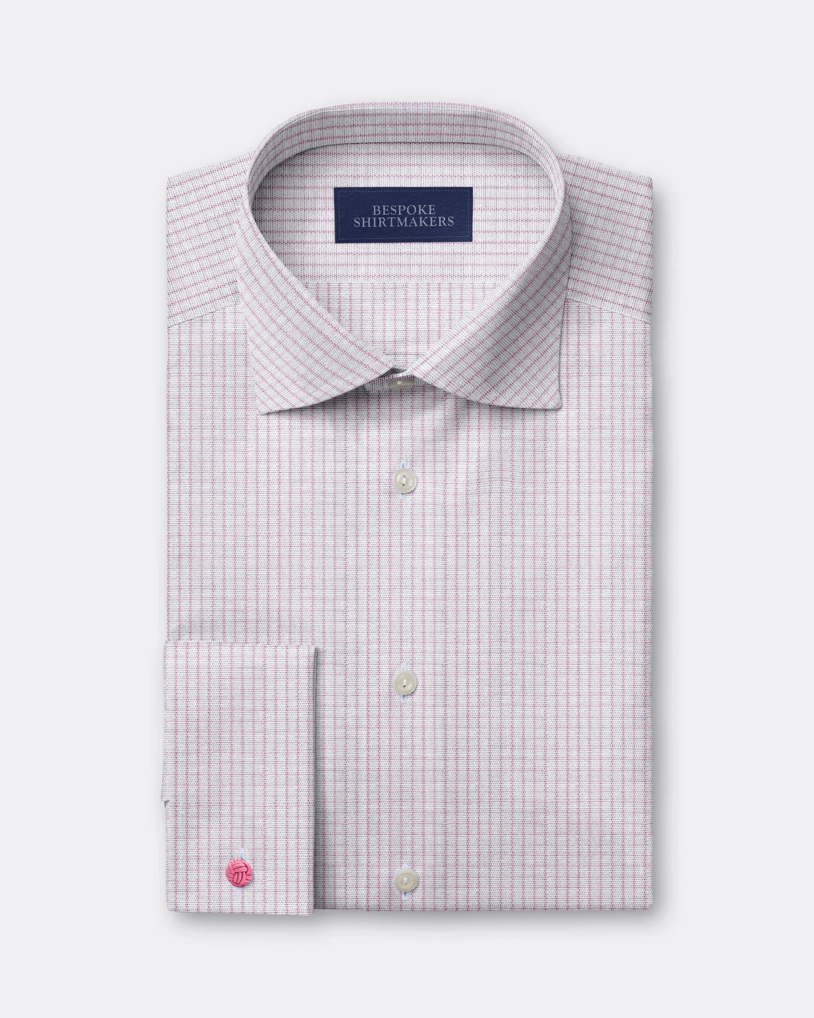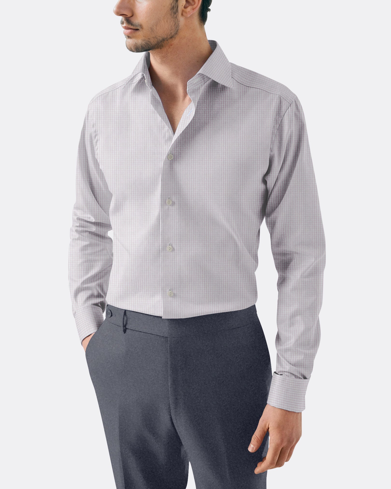 The Pink Poplin Check Shirt brings subtle colour into formal business wear. Woven from lightweight cotton poplin, it has a crisp, breathable finish that holds its shape throughout the day. The Italian spread collar frames a tie neatly, giving the shirt a refined edge that stands out in professional settings without feeling overdone.